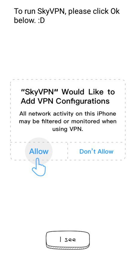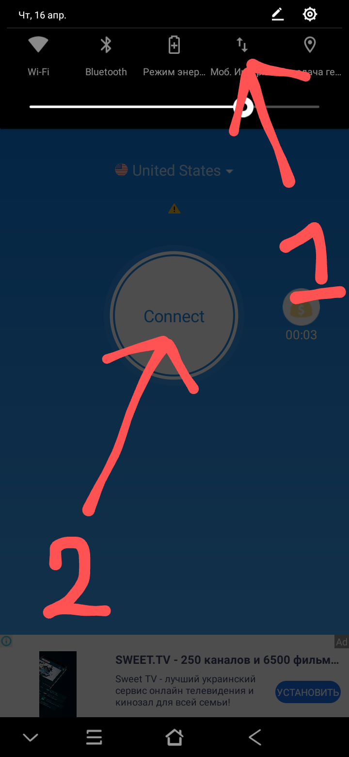 Нажимаете «Allow» и вам должно показать ещё одно окно в котором вы должны нажать кнопку «Ок». Если всего этого не произошло, то вам нужно сперва включить вайфай или попросить на пару секунд раздачу у знакомого и после того зайти в программу и сделать всё, что было указано выше. После того как вы всё сделали включаем моб. интернет и в программе нажимаем кнопку «Connect»